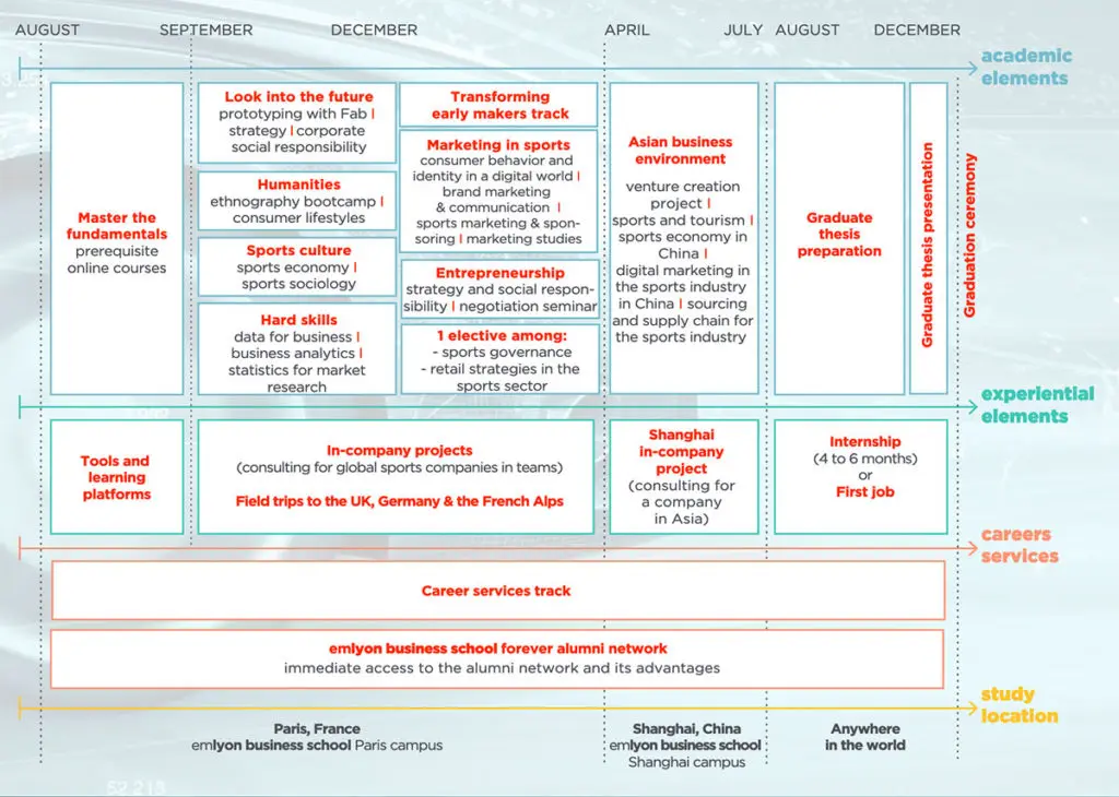 Der MSc, aufgeteilt auf die Campus Paris und Shanghai, vermittelt ein detailliertes Verständnis für das internationale Sport Businesses, um so zukünftige Führungskräfte mit fundiertem Fachwissen und Einsicht in die sportwirtschaftliche Kultur hervorzubringen.