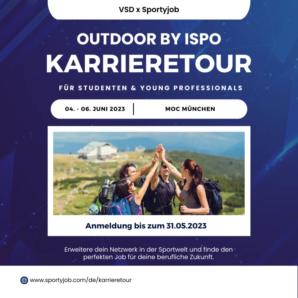 Nach dem erfolgreichen Start auf der ISPO Munich 2022 bietet Sportyjob in Zusammenarbeit mit dem Berufsverband Sportökonomie und Sportmanagement Deutschlands (VSD) die Karrieretour auch auf der OutDoor by ISPO 2023 an. Diesmal liegt der Schwerpunkt auf Arbeitgeber aus dem Outdoorbereich.
