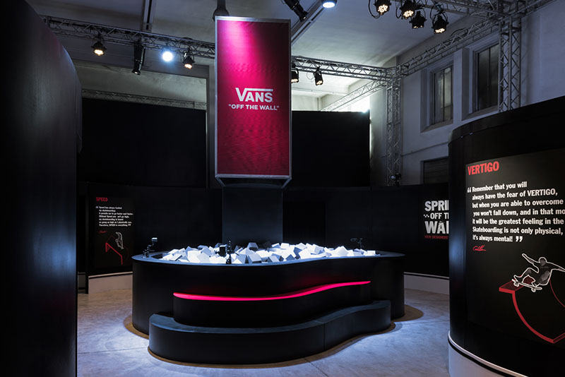 Under the motto of Speed, Balance and Vertigo, visitors of the Milano Design Week could live the sensations of skateboarding by jumping into a foam pit, surfing through clouds like a Silver Surfer or walk on huge unstable foam waffle soles.